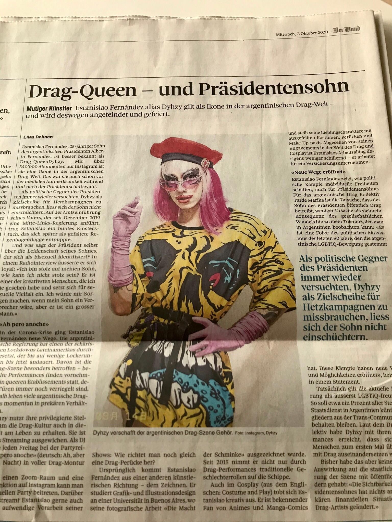 Un extenso perfil de Estanislao Fernández fue publicado en el diario sueco Der Bund. "Drag-Queen e hijo presidencial" es el título de la nota que salió en la versión papel y también en el portal online. Allí, cuenta la historia de Dyzhy el hijo Alberto Fernández y el rol que tiene en la comunidad LGBTIQ.