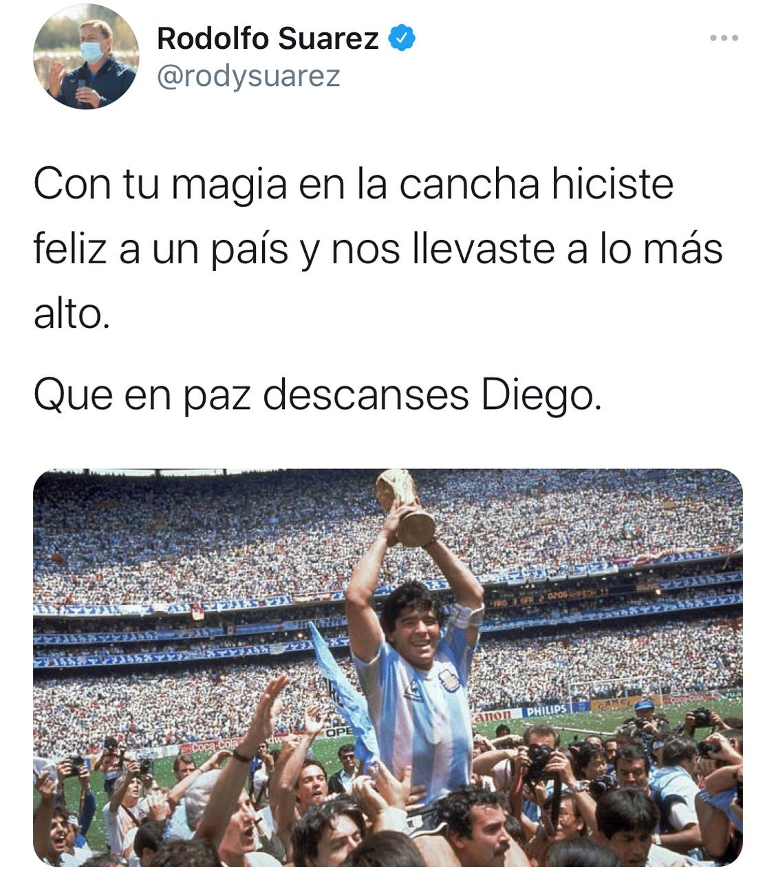 El gobernador de Mendoza, Rodolfo Suarez, se sumó a las condolencias que expresan figuras del deporte, la política, el arte, y más y eligió Twitter para expresar su tristeza.