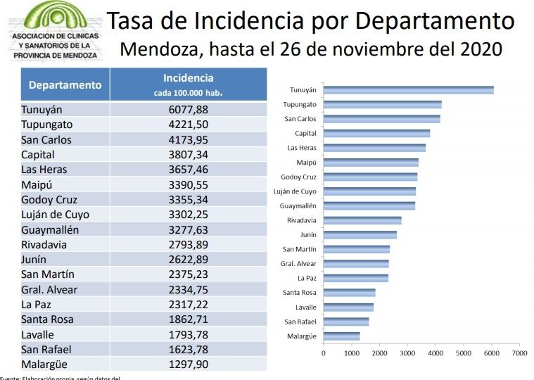 Tunuyán, Tupungato y San Carlos, en ese orden, son los tres municipios de la provincia con mayor tasa de incidencia de casos de covid-19. Esos datos no tienen que ver con la cantidad bruta de casos, sino por la cantidad de personas contagiadas en relación con los habitantes del lugar. Tunuyán tiene 6077,88 casos cada 100 mil habitantes. Tupungato 4221 casos cada 100 mil habitantes y San Carlos le sigue de cerca. Luego le siguen Capital, Godoy Cruz y Maipú. En ese caso sí municipios del Gran Mendoza.