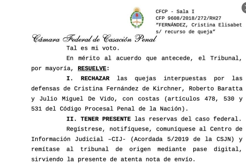 Según el fallo, el Tribunal por mayoría resolvió rechazar las quejas interpuestas por las defensas de Cristina, Roberto Baratta y De Vido. La causa tiene a CKF como acusada de ser la jefa de una asociación ilícita que recaudaba coimas de empresarios que hacían negocios con el Estado.