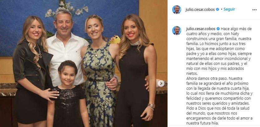 "Hace algo más de cuatro años y medio, con Naty construimos una gran familia, nuestra familia. Lo hicimos junto a sus tres hijas, las que me adoptaron como padre y yo a ellas como hijas, siempre manteniendo el amor incondicional y natural de ellas con sus padres, y el mío con mis hijos y mis adorados nietos", comenzó su publicación Cobos.
