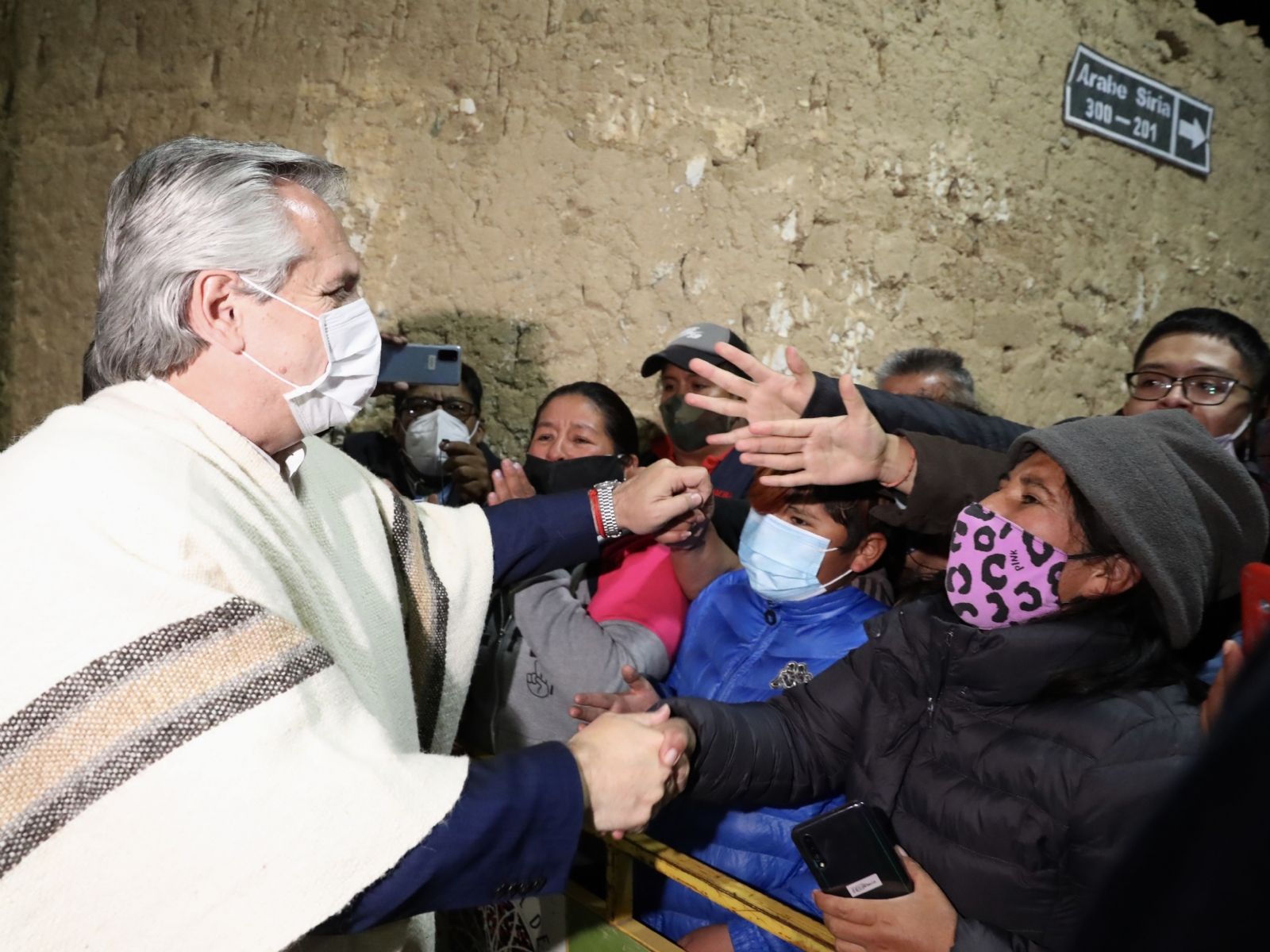 Enfundado en un poncho, y haciendo uso de un barbijo, el Presidente se acercó a saludar a las personas -Adela, una vecina de 104 años dio el presente- que esperaban su llegada.