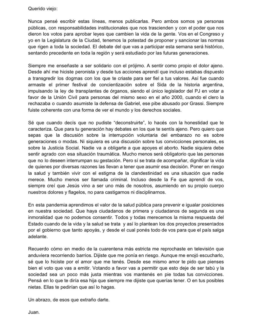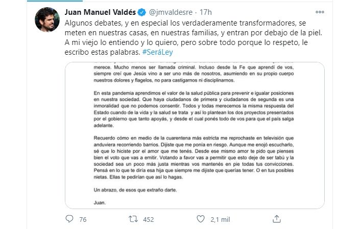 Juan Manuel Valdés es legislador en la Ciudad de Buenos Aires y presionó abiertamente a su padre para que "piense bien su voto". "Te pido que pienses bien pienses bien el voto que vas a emitir. Votando a favor vas a permitir que esto deje de ser tabú y la sociedad sea un poco más justa mientras vos mantenés en pie todas tus convicciones. Pensá en lo que te diría esa hija que siempre me dijiste que querías tener. O en tus posibles nietas. Ellas te pedirían que así lo hagas", expresa la carta que publicó en las redes sociales.