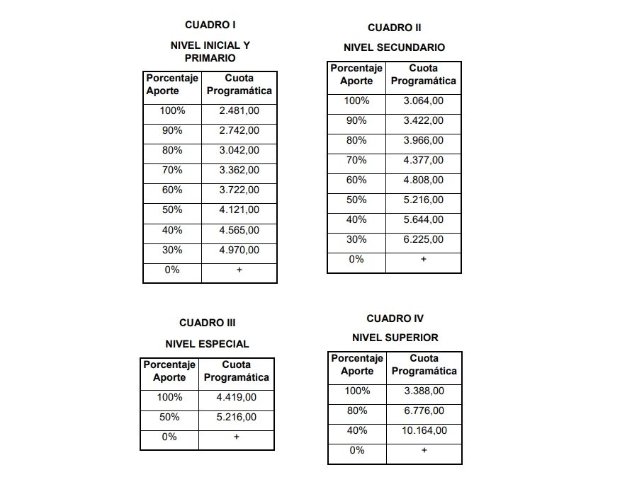 Según consta en el anexo de la resolución firmada por José Thomas, las escuelas de nivel primario que tienen un porcentaje de aporte del 100% tendrán una cuota programática de 2.481 pesos. Así de forma progresiva hasta una cuota programática de $4970 pesos para las escuelas con 30% de aporte.