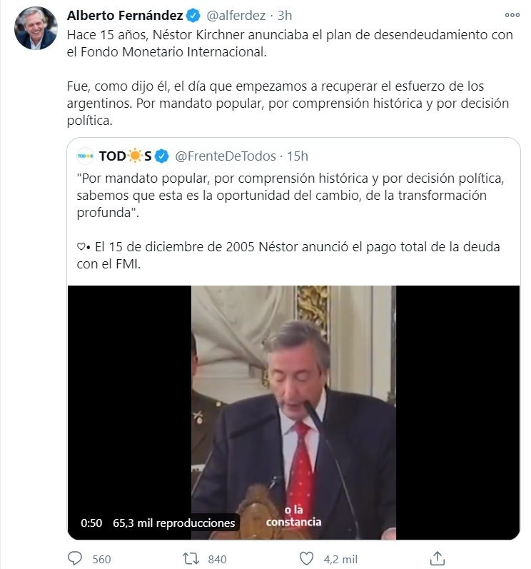 A través de un breve posteo que replica otro de la cuenta oficial del Frente de Todos, que muestra un video del momento en que Kirchner proclamaba la cancelación de los compromisos asumidos con el FMI, Fernández no dudó en cargar nuevamente de épica una acción considerada icónica por los adherentes al kirchnerismo.