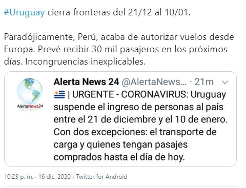 Durante la noche del miércoles, el presidente de Uruguay, Lacalle Pou, anunció que debido al avance de nuevos casos de coronavirus, suspenderá el ingreso al país desde el 21 de diciembre hasta el 10 de enero. "Tomamos la decisión de suspender el ingreso al país entre el 21 de diciembre y el 10 de enero", sostuvo el mandatario frente a la prensa.