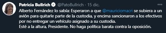 Fue la presidenta del PRO, Patricia Bullrich, quien denunció la situación en su cuenta de Twitter. "Esperaron a que Mauricio Macri se subiera a un avión para quitarle parte de la custodia y encima sancionaron a los efectivos por no entregar un vehículo asignado a su custodia", se quejó Bullrich, y le exigió a Alberto Fernández que "esté a la altura" y que "no haga política barata contra la oposición".