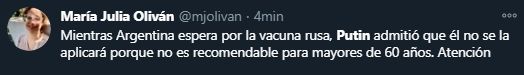 Las declaraciones del mandatario ruso inmediatamente generaron una catarata de críticas en redes sociales a raíz de que el Gobierno argentino había anunciado que le pondría esa vacuna a quienes están en grupos de riesgo por el coronavirus.