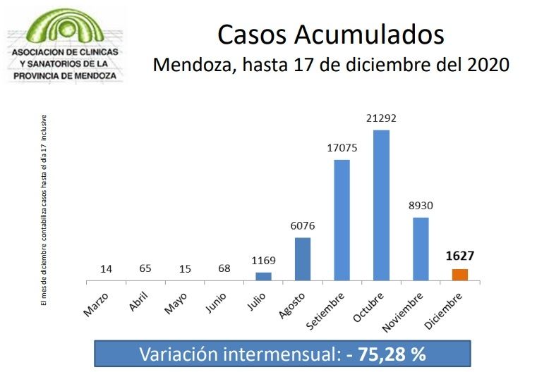 "La segunda ola puede ser inminente", dijo el gobernador Rodolfo Suarez al referirse al estado de situación de la pandemia de coronavirus en Mendoza. Esas palabras parecen contrastar con los datos, pero no es tan así. El covid amenguó su impacto, al menos en casos diagnosticados, y diciembre será el mes con menos contagiados desde julio y el segundo mes consecutivo de baja constante. Las presión sobre el sistema de salud se "relajó" y la tasa de positividad, es decir las personas diagnosticadas según la cantidad de testeos, es bajísima (13%).