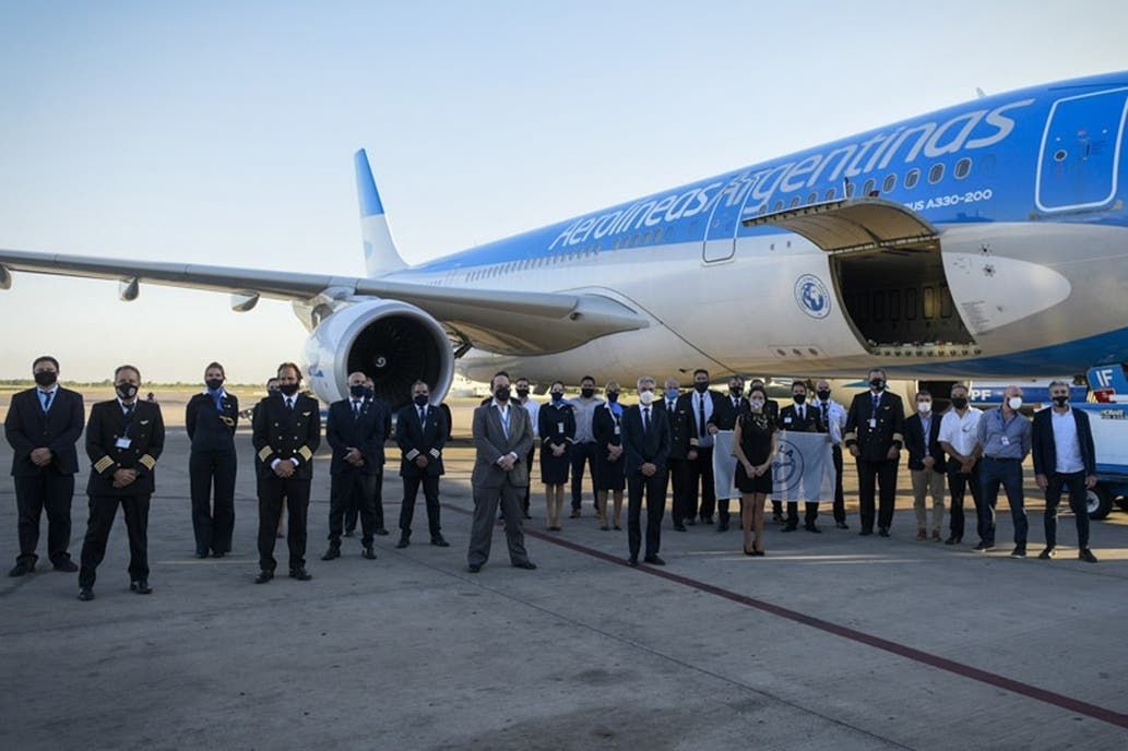 El avión Airbus 330-200, especialmente modificado para el transporte de las vacunas, partió con una dotación de 20 personas, compuesta por una tripulación de cuatro comandantes, cuatro copilotos y dos de "backup", además de tripulantes de cabina y técnicos.