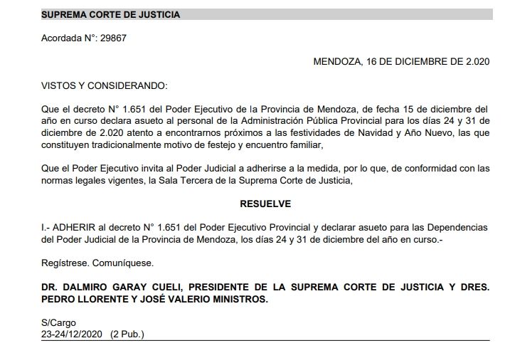 La acordada toma como punto de partida el decreto 1651 del Poder Ejecutivo, firmado el 15 de diciembre y que "declara asueto al personal de la Administración Pública Provincial para los días 24 y 31 de diciembre de 2.020 atento a encontrarnos próximos a las festividades de Navidad y Año Nuevo, las que constituyen tradicionalmente motivo de festejo y encuentro familiar".