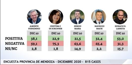 Según el detalle de la encuesta en el territorio mendocino la imagen positiva de la vicepresidenta es apenas del 22,9%. Pero lo mismo ocurre con el resto de las autoridades del Frente de Todos.