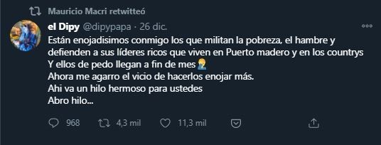 Mauricio Macri retuiteó un extenso posteo del cantante El Dipy, en donde se lo ve criticar con dureza a la actual gestión de Alberto Fernández y Cristina Kirchner. El hilo muestra críticas hacia el gobierno en distintos programas de televisión.