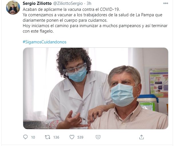 Por ejemplo el gobernador de La Pampa, Sergio Ziliotto. "Acaban de aplicarme la vacuna contra el COVID-19. Ya comenzamos a vacunar a los trabajadores de la salud de La Pampa que diariamente ponen el cuerpo para cuidarnos", manifestó el mandatario.