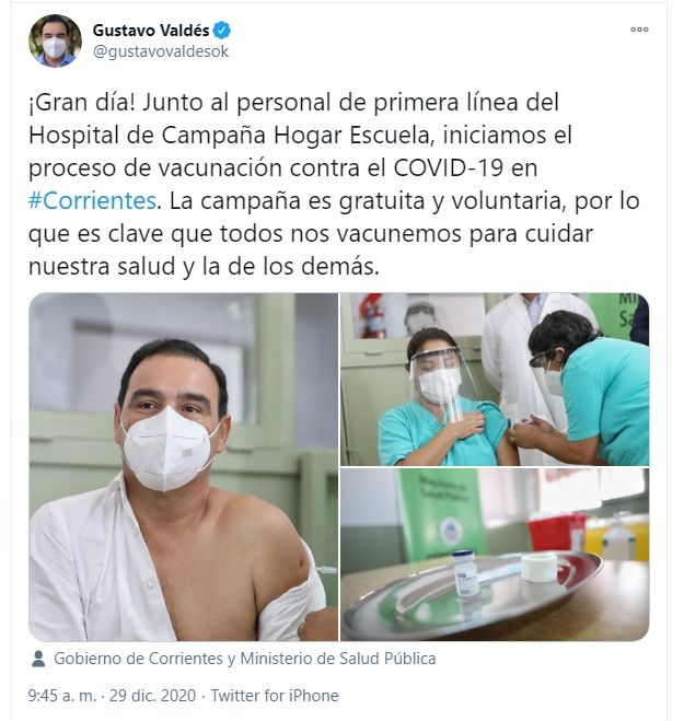 Por su parte, el gobernador radical de Corrientes, Gustavo Valdés, también se mostró aplicándose la primera dosis de la vacuna del instituto Gamaleya. "¡Gran día! Junto al personal de primera línea del Hospital de Campaña Hogar Escuela, iniciamos el proceso de vacunación contra el COVID-19 en Corrientes", expresó y remarcó que la campaña es "gratuita y voluntaria". "Es clave que todos nos vacunemos para cuidar nuestra salud y la de los demás", señaló.