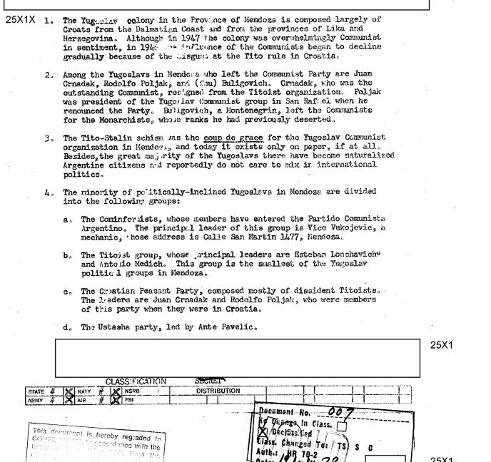 "El Partido Campesino Croata, compuesto mayormente por disidentes Titoistas. Los líderes son Juan Crnadak y Rodolfo Poljak, quienes fueron miembros de este partido cuando estuvieron en Croacia", informa. Incluso el partido más reaccionario tenía arraigo en Mendoza, según los espías de la CIA. "El Partido Ustasha, liderado por Ante Pavelic", menciona.