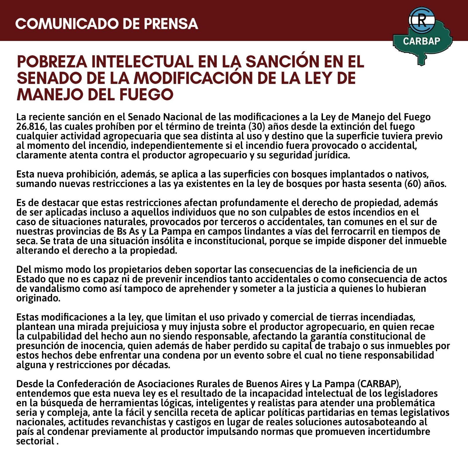 A través de un duro comunicado la Confederación de Asociaciones Rurales de Buenos Aires y La Pampa (Carbap) aseguró que la nueva ley que prohíbe el cambio de uso de un suelo que se ha incendiado "es el resultado de la incapacidad intelectual de los legisladores en la búsqueda de herramientas lógicas, inteligentes y realistas para atender una problemática seria y compleja". El ataque está dirigido directamente al autor de la iniciativa, Máximo Kirchner.