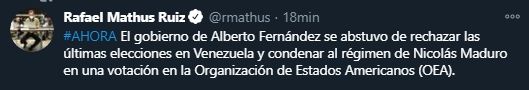 El presidente Alberto Fernández se ha mantenido en silencio al respecto para no generar tensiones dentro de la coalición del Frente de Todos. Sin embargo, la expectativa estaba puesta en lo que iba a hacer Raimundi, quien ya había generado polémica en septiembre cuando se opuso al informe de la ONU sobre la violación de derechos humanos en Venezuela.