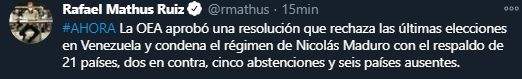 La resolución de la OEA fue aprobada por 21 delegaciones, hubo seis ausencias, cinco abstenciones y dos países votaron en contra, México y Bolivia. La postura del representante argentino simbolizaron la tensión que hay en la coalición del Frente de Todos sobre la situación política y económica de Venezuela.