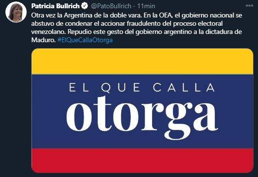 La presidenta del PRO, Patricia Bullrich, condenó enfáticamente la actitud adoptada por el Gobierno argentino y sus representantes. "Otra vez la Argentina de la doble vara. En la OEA, el gobierno nacional se abstuvo de condenar el accionar fraudulento del proceso electoral venezolano. Repudio este gesto del gobierno argentino a la dictadura de Maduro. #ElQueCallaOtorga", escribió la exministra de Seguridad.