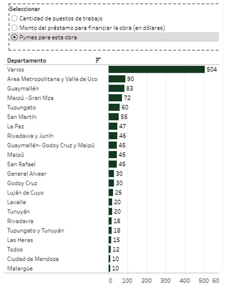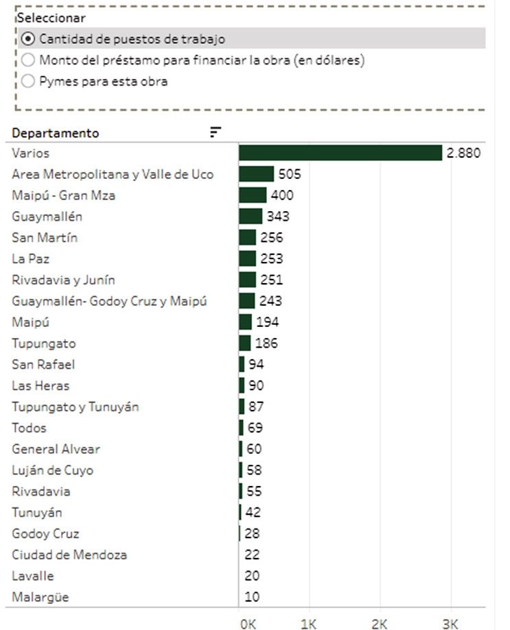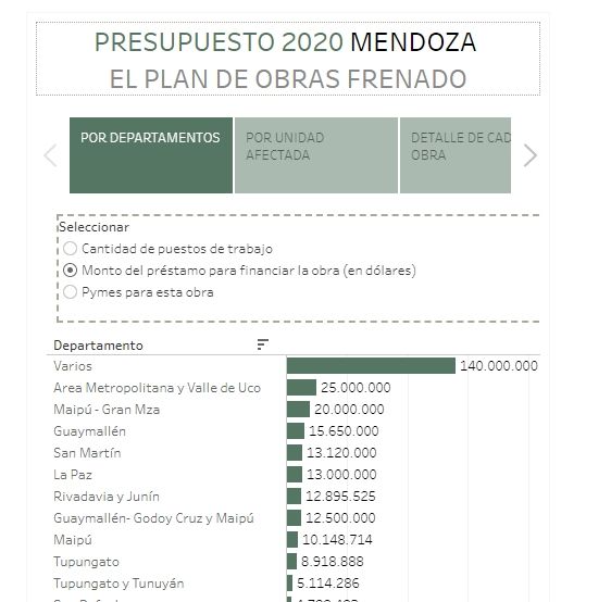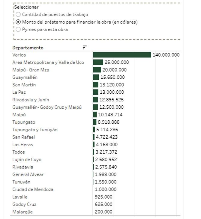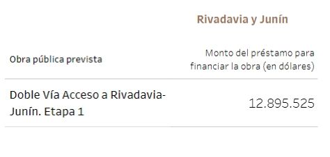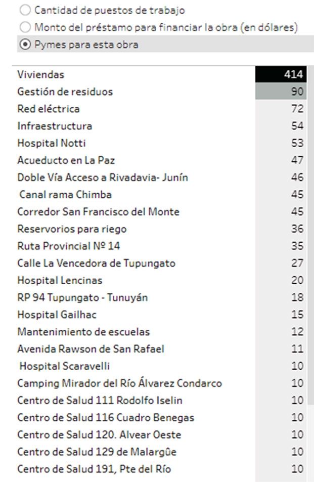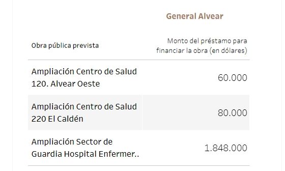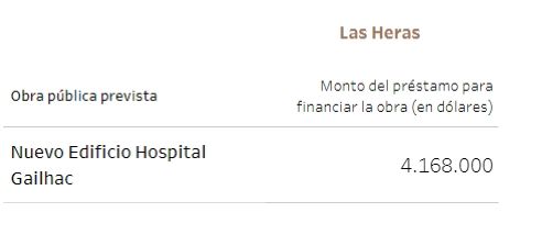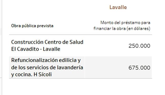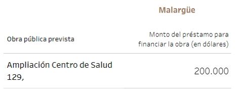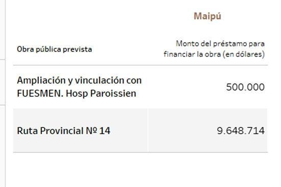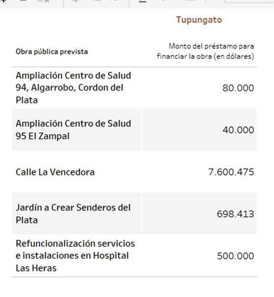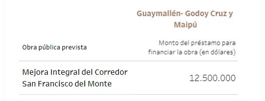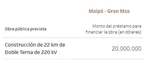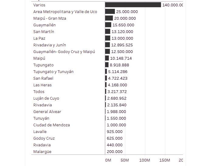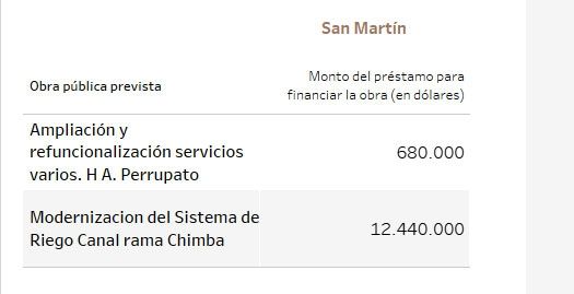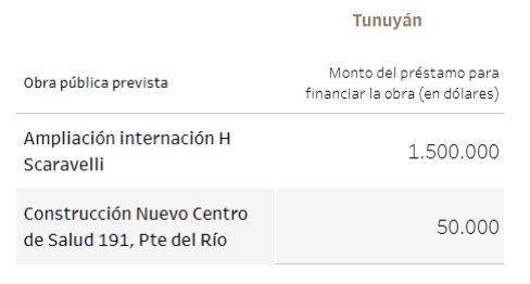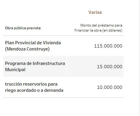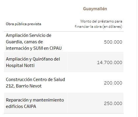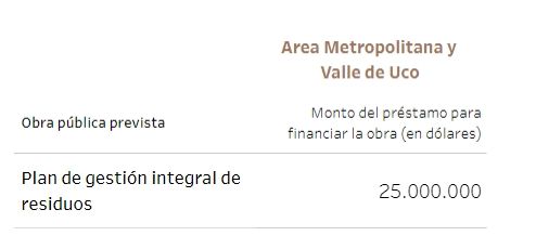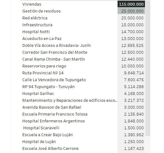 Unos 115 millones de dólares tenían previsto ir a viviendas y 25, a la gestión de residuos. En cuanto a establecimientos públicos, 14,7 millones de dólares para el hospital Notti, 13 millones para un acueducto en La Paz y 12,8 millones para la doble vía de acceso a Rivadavia - Junín, entre los principales.
