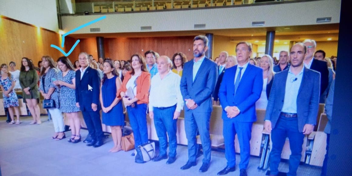 Mientras la plana mayor del Gobierno provincial permanecía de pie y, aparentemente, entonaba el Himno, un fotógrafo captó a la legisladora manipulando su teléfono celular.
