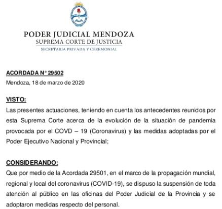 En el caso de Mendoza, la acordada 29502 establece la reducción de servicios en la justicia, al punto que se los presta con mínimo personal.
