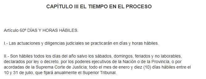 Los días hábiles surgen del artículo 60 del Código Civil Procesal y Tributario, que es la Ley 9001, que establece cuáles son los días hábiles del año (en el inciso 2). En este caso, la inhabilidad es una excepción del inciso 2 del artículo 60. Y aclara que Todos los días son hábiles salvo las establecidas por acordadas de la Suprema Corte,