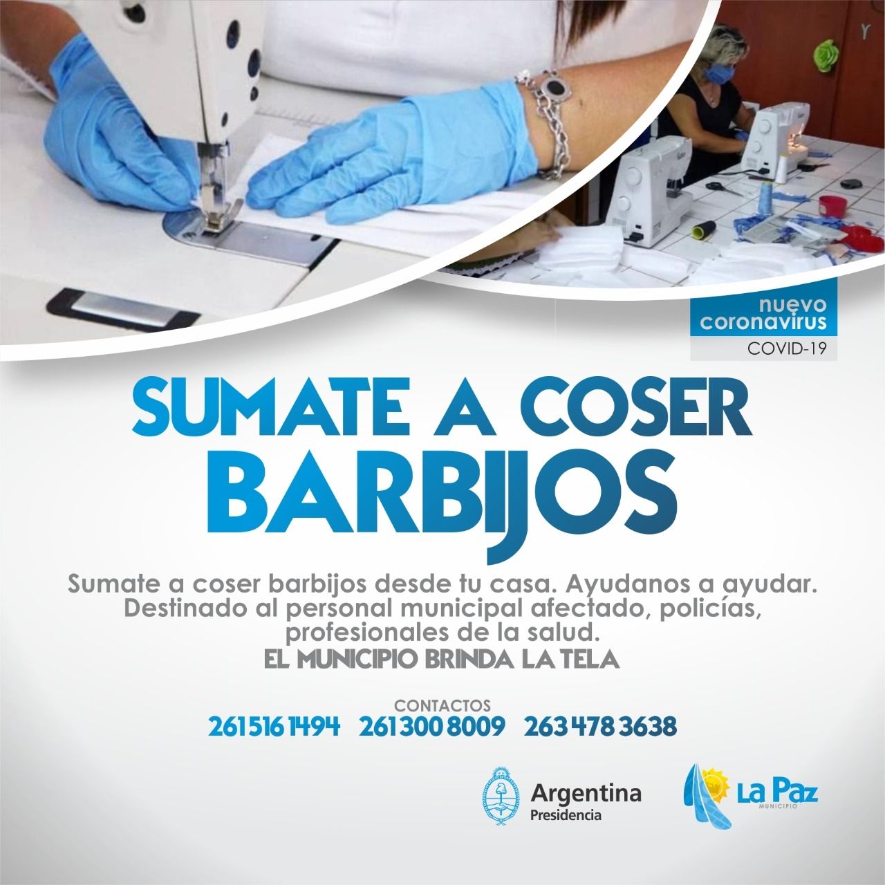Los paceños que quieran participar, puedan comunicarse vía telefónica con los números brindados desde la Municipalidad (2615161494 - 2613008009 – 2634783638), para hacer saber de su intención de sumarse a este acto solidario y desde la administración departamental se les hará llegar tela para la confección de estos elementos.