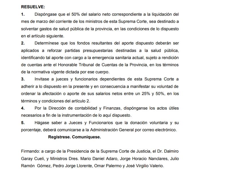 Esa misma acordada invita a jueces, equiparados a magistrados y fiscales a adherir a la iniciativa y proceder a la donación de entre el 25% y el 50% de sus salarios netos para reforzar el sistema sanitario.