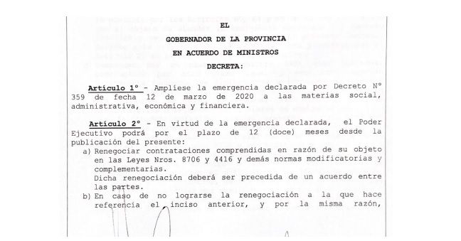 Rodolfo Suarez tiene una enorme responsabilidad ahora. El Decreto que amplió la emergencia, como había anticipado MDZ, le otorga facultades especiales, pero también busca blindar al Estado de Mendoza para no tener problemas por cumplimiento de contratos y falta de pagos. Por eso declara “inembargables” las cuentas y blinda a todos los organismos estatales de cualquier litigio. Suarez puede renegociar contratos y hasta establecer condiciones de manera unilateral.