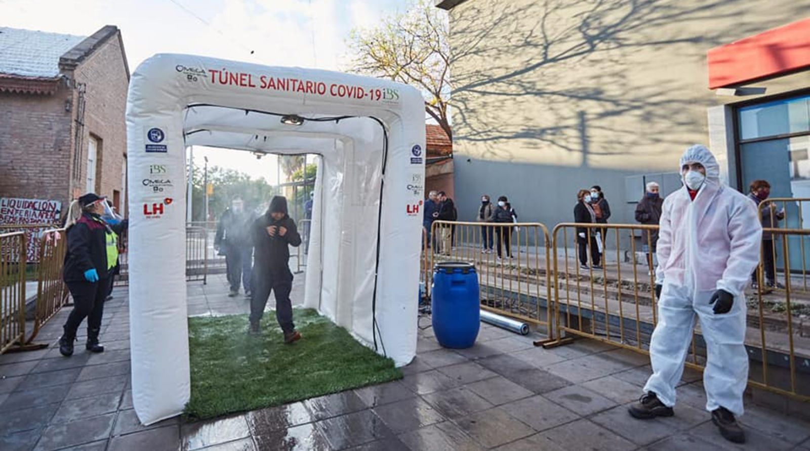 Esta mañana el centro cívico de Las Heras estrenó un túnel sanitario que sirve para desinfectar a los ciudadanos que se acercan a realizar trámites al banco. La empresa proveedora del sistema es Omega Saneamientos.