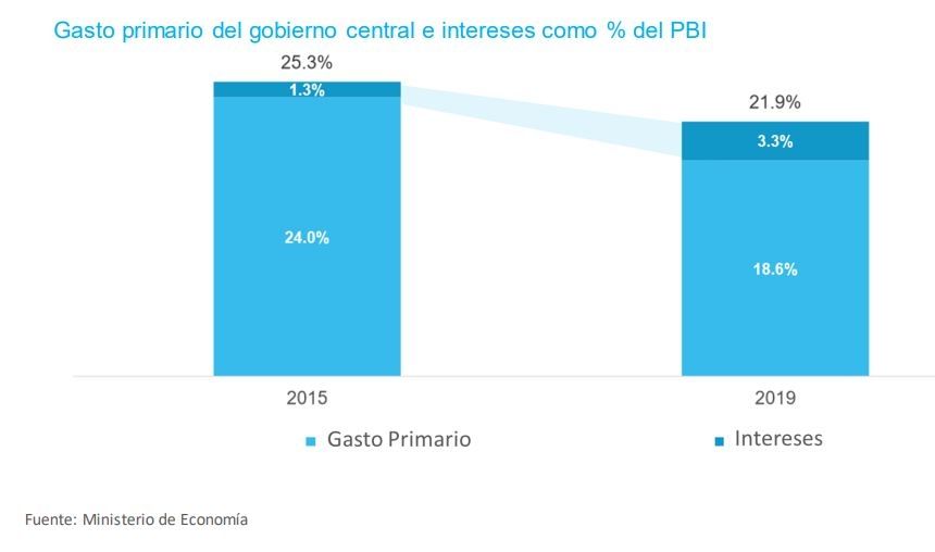 Reducida capacidad de ajuste fiscal dado el esfuerzo soportado por la sociedad en bajar Gasto Primario. Esta situación se agrava por el deterioro de la situación social a fines de 2019 y la crisis sanitaria por el Covid19.