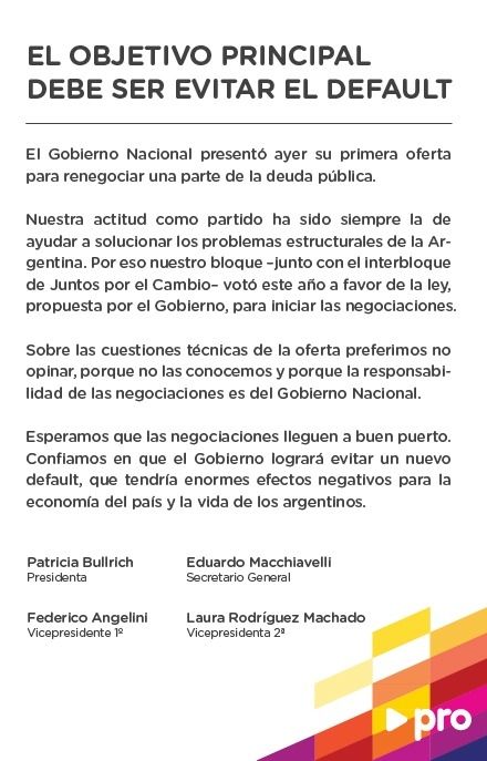 El partido se pronunció en ese sentido en un comunicado titulado "El objetivo principal debe ser evitar el default", firmado por su presidenta, Patricia Bullrich, el secretario general, Eduardo Macchiavelli, el vicepresidente primero, Federico Angelini y la vicepresidenta segunda, Laura Rodríguez Machado.