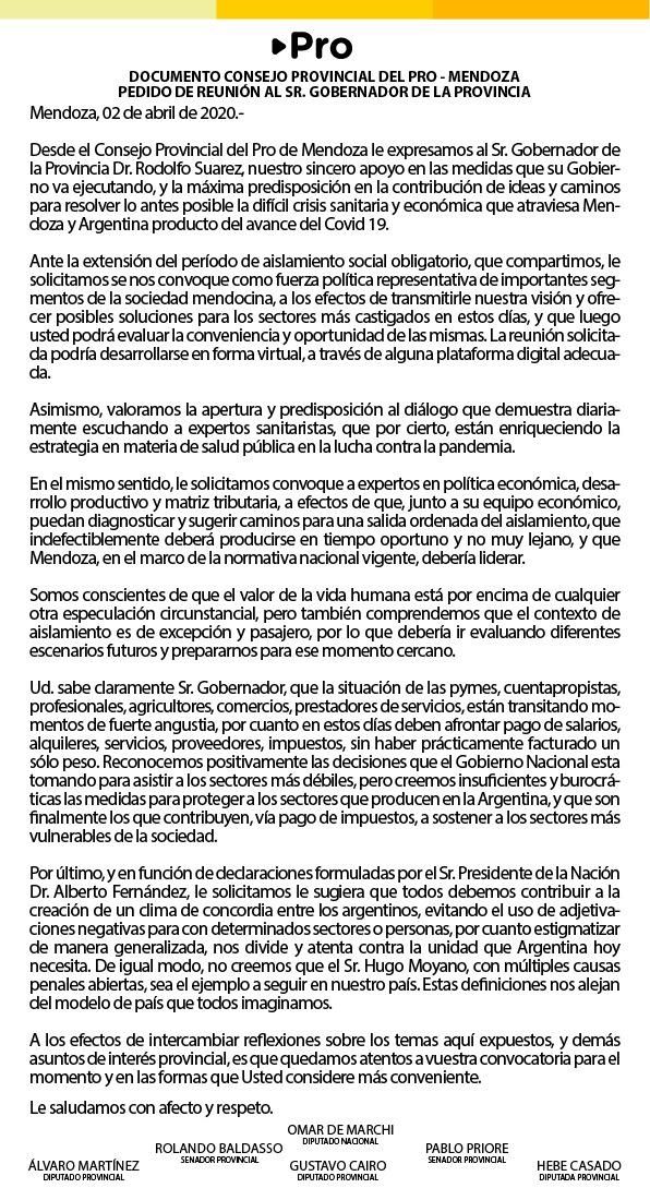 En una nota que el legislador publicó por medio de su cuenta de Twitter, el documento señala que apoya a Suarez en las medidas tomadas en la provincia y que todo el sector del PRO de Mendoza -que De Marchi preside- está a su disposición para contribuir en "ideas" en la crisis sanitaria que trajo el Covid-19.