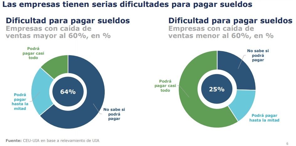 Uno de los aspectos más complejos tiene que ver con las obligaciones de las empresas hacia el fisco, los proveedores y, sobre todo, los trabajadores. Según la encuesta, el 87% de las empresas tiene “serias dificultades para pagar sueldos” y 6 de cada 10 respondió que “no podrá pagar sueldos”.