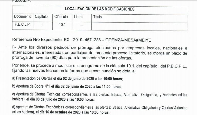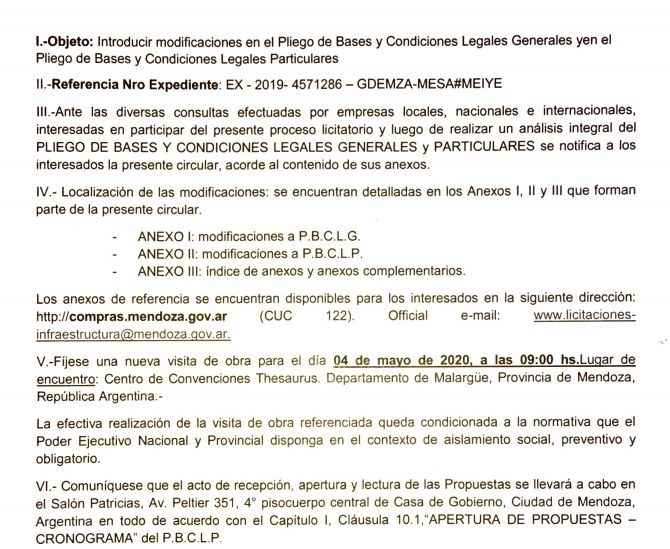 La fecha de apertura de la licitación no se ha modificado y en el Gobierno aseguran que la intención es mantener el proceso. El próximo 4 de mayo debe realizarse una segunda visita al lugar, cuestión que se complica por las restricciones para viajar. Sin embargo, la actividad sigue en pie. “El proceso sigue con total normalidad. La pandemia no ha impactado en ninguna de las actividades previstas. La intención es que participen la mayor cantidad de empresas posibles y en especial todas las empresas de Mendoza. La obra es enorme y diversa”, aseguró el ministro de Obras Mario Isgró.