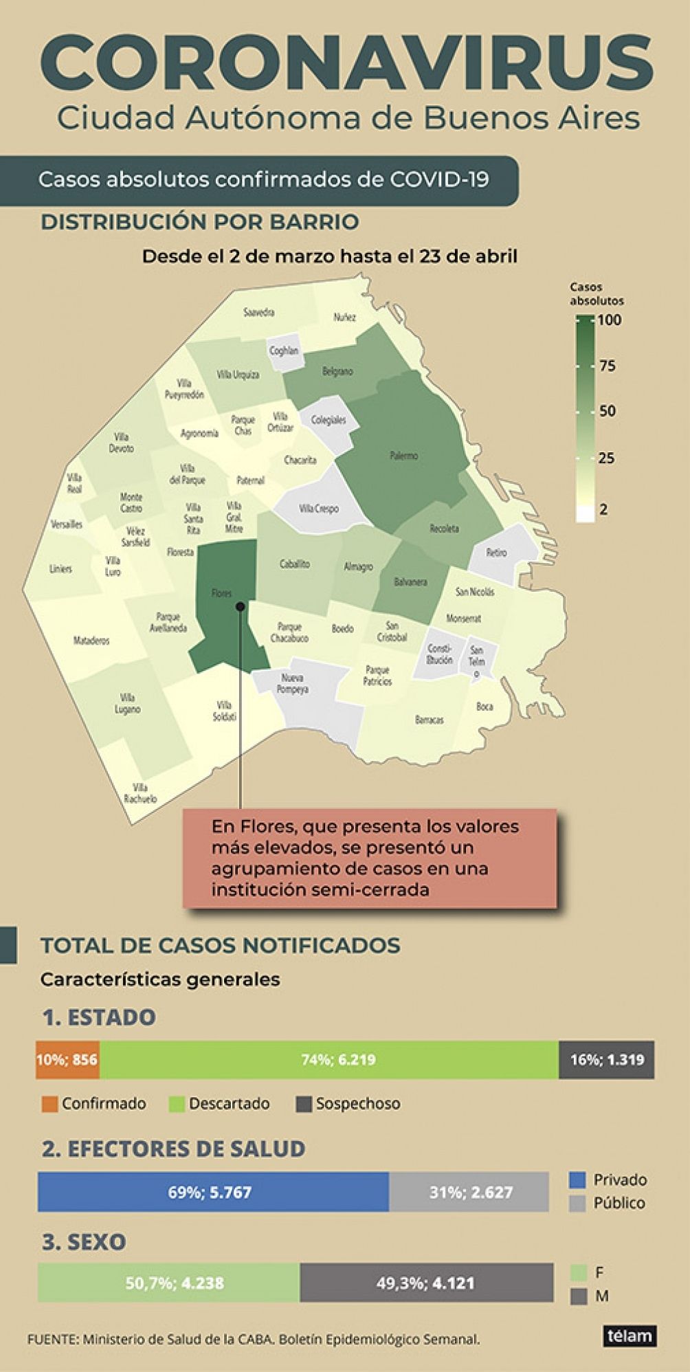 Con respecto a los casos confirmados en Flores, el estudio indicó que "en este barrio se presentó un agrupamiento de casos en una institución semi-cerrada".