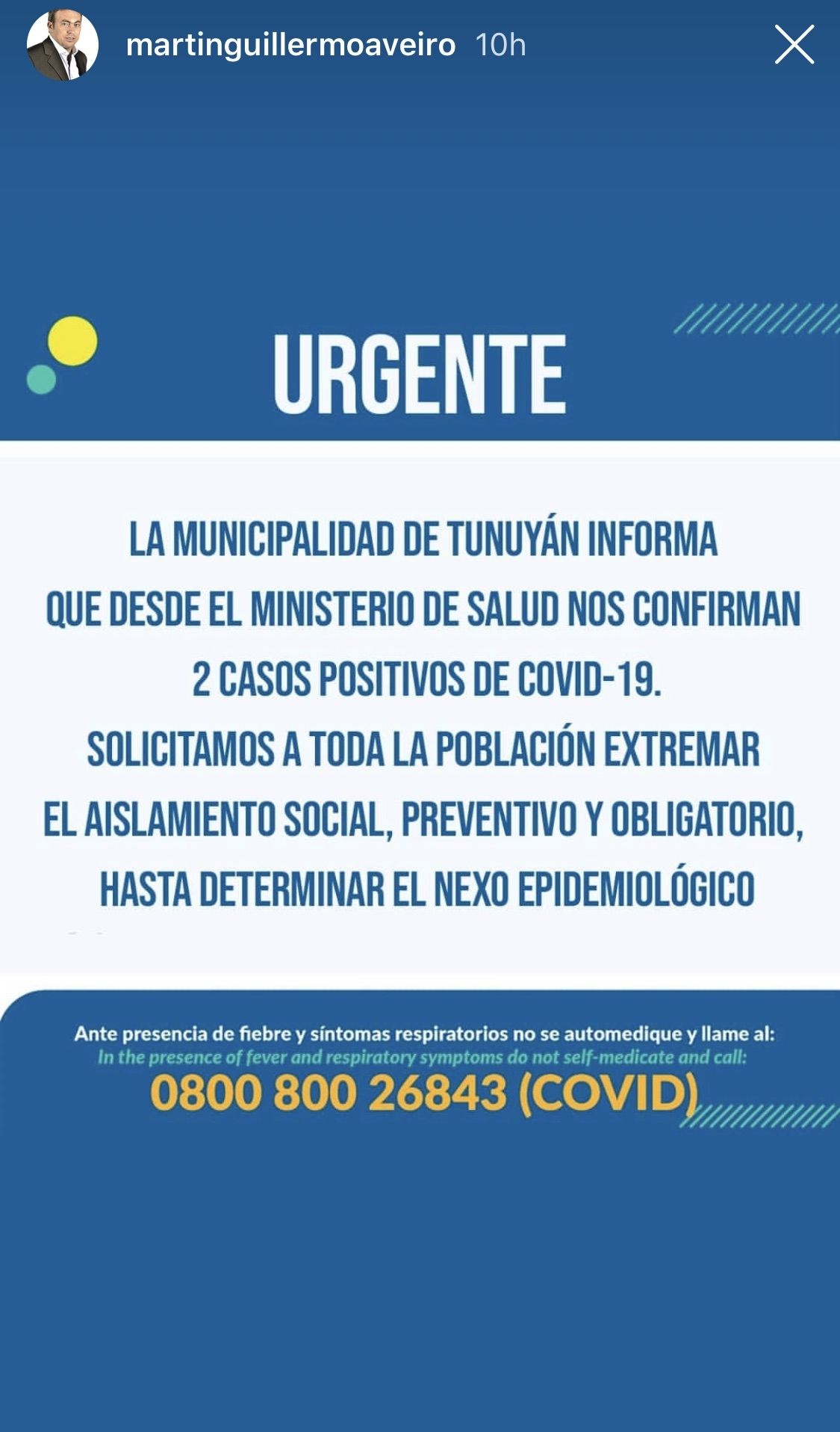 El intendente de Tunuyán, Martín Aveiro, decidió pronunciarse a través de la red social Instagram con un mensaje para quienes residen en ese departamento, al respecto de los dos casos positivos de Covid-19 que se conocieron ayer.
