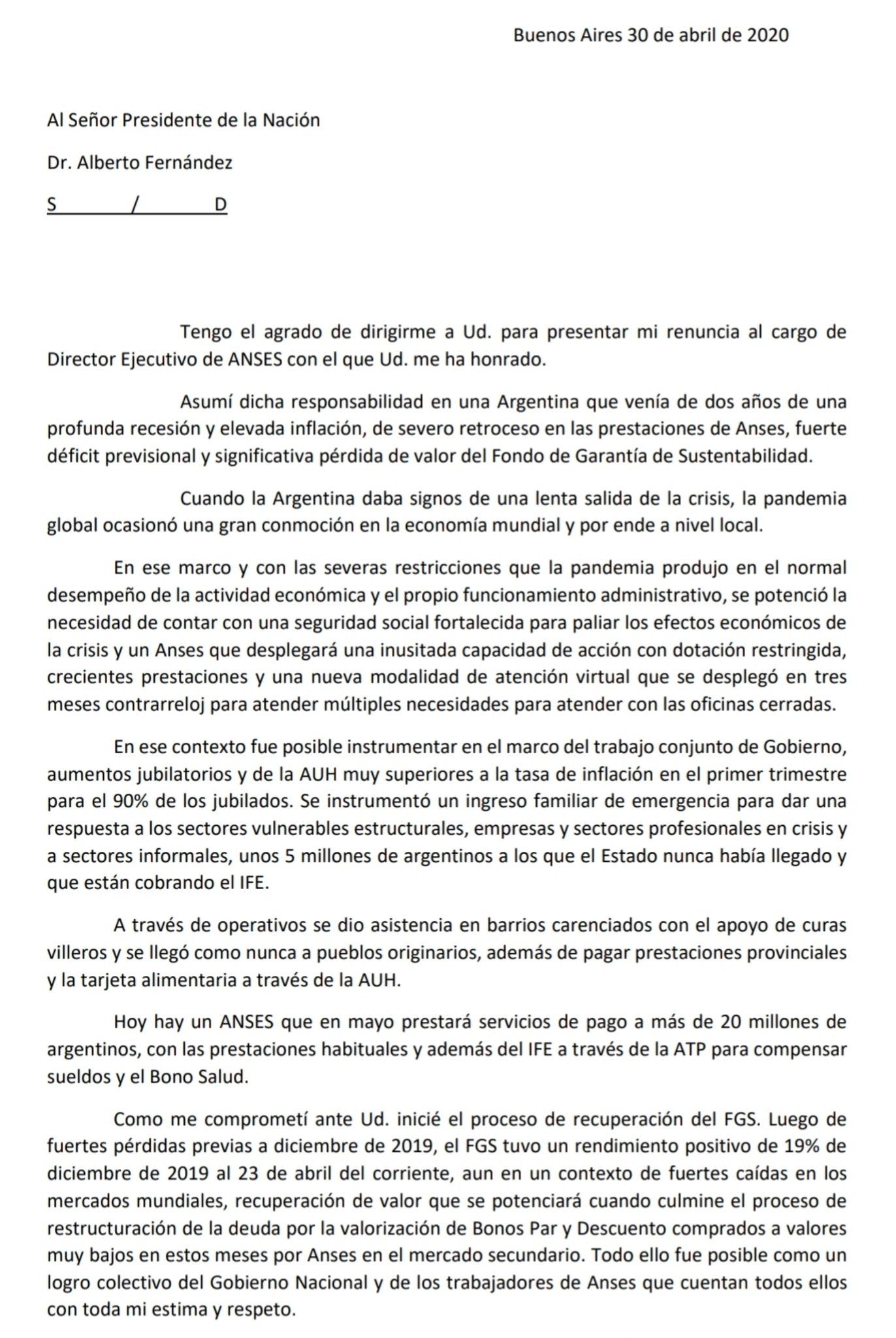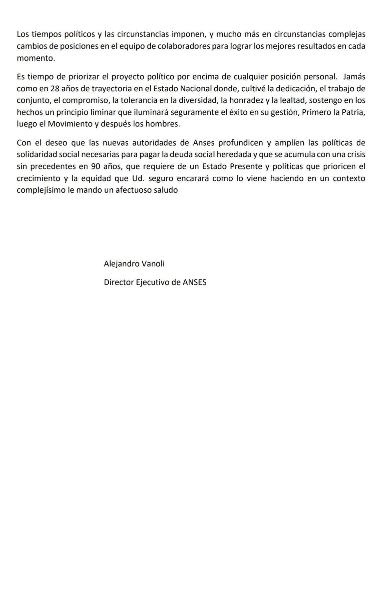 El ahora ex director ejecutivo de Anses, Alejandro Vanoli, publicó en su cuenta de Twitter la carta de renuncia solicitada por el jefe de Gabinete, Santiago Cafiero, por expreso pedido del presidente.