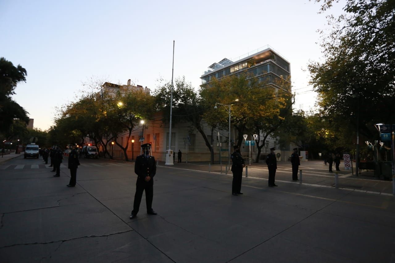 Sólo se puede observar un modesto operativo policial que dado la circunstancias parece -incluso- excesivo. Uniformados y vallas esperan al gobernador para que, luego del izamiento de la bandera, pronuncie su discurso.