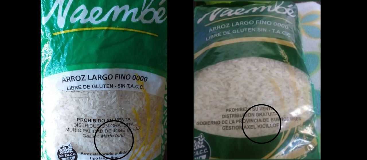 En medio del debate por la veracidad o no de la imagen, en las redes sociales comenzaron a aparecer otras imágenes de paquetes de arroz de la marca “Ñaembé”, pero esta vez con la leyenda “Prohibida su venta. Distribución gratuita. Municipalidad de José C. Paz. Gestión Mario Ishii” (ver acá y acá), con la misma tipografía que se puede apreciar en el paquete adjudicado a Axel Kicillof.