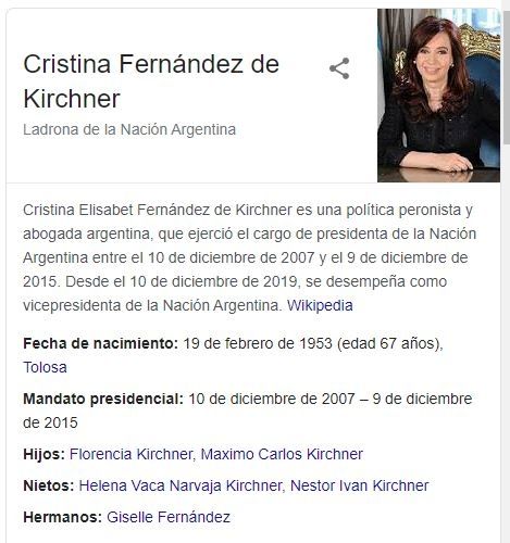 La polémica atribución figuró esta mañana en el panel de conocimiento de la vicepresidenta Fernández de Kirchner, que suele aparecer al inicio de la búsqueda. Según ha explicado Google en el pasado, estos recuadros "están pensados para ofrecer un resumen de información sobre un tema específico", que puede ser una persona, un lugar, una organización o "cosas".