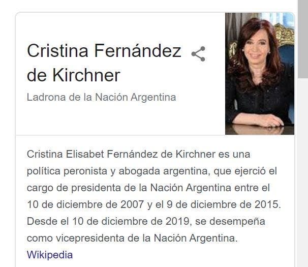 Además, alguien cambió durante un tiempo su descripción breve, de "político argentino" a "delincuente y parásito argentino".