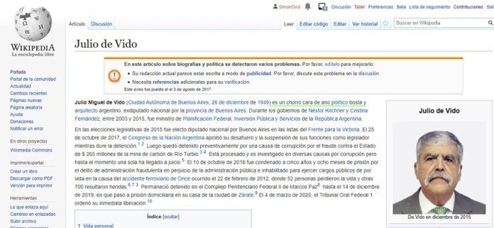 Luego de conocido este dato, algunas personas se lanzaron de manera entusiasta a modificar algunas páginas de políticos que estuvieron involucrados en casos de corrupción, entre los que se destacó el ex vicepresidente Amado Boudou.