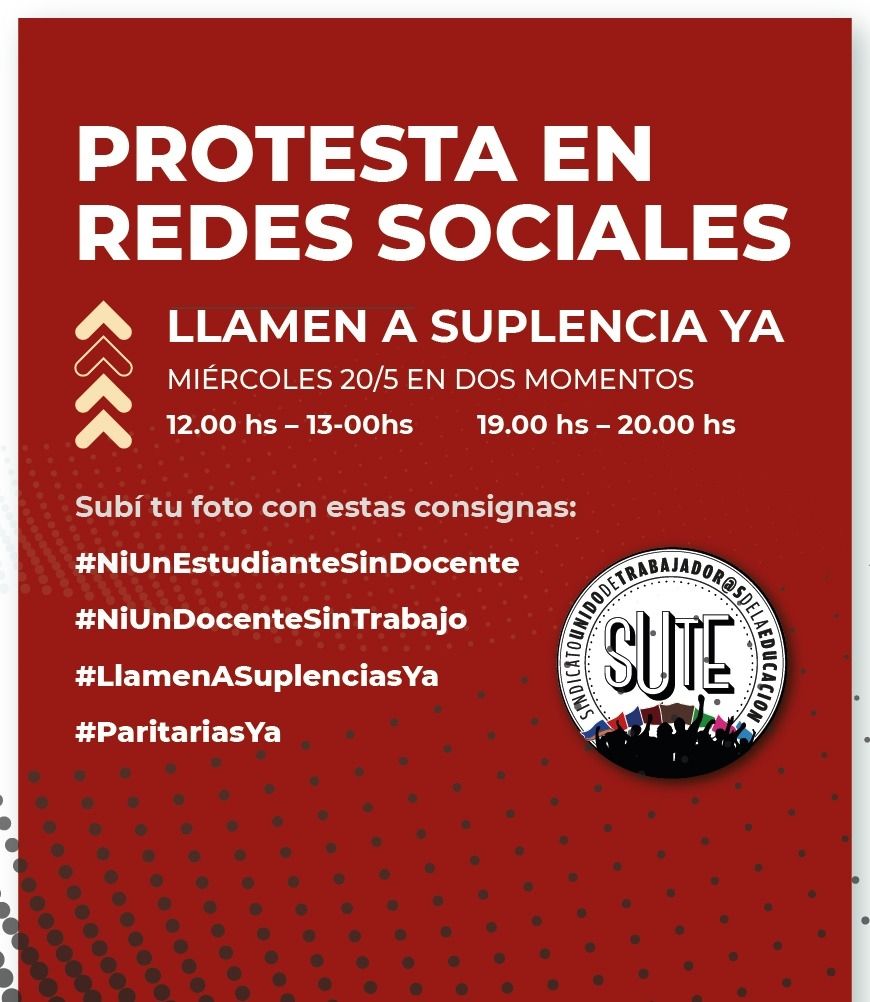 Precisamente, para hacer escuchar su reclamo en tiempos de pandemia y aislamiento social obligatorio, el SUTE convoca a una protesta en las redes sociales, con dos horarios definidos: de 12 a 13 y de 19 a 20.