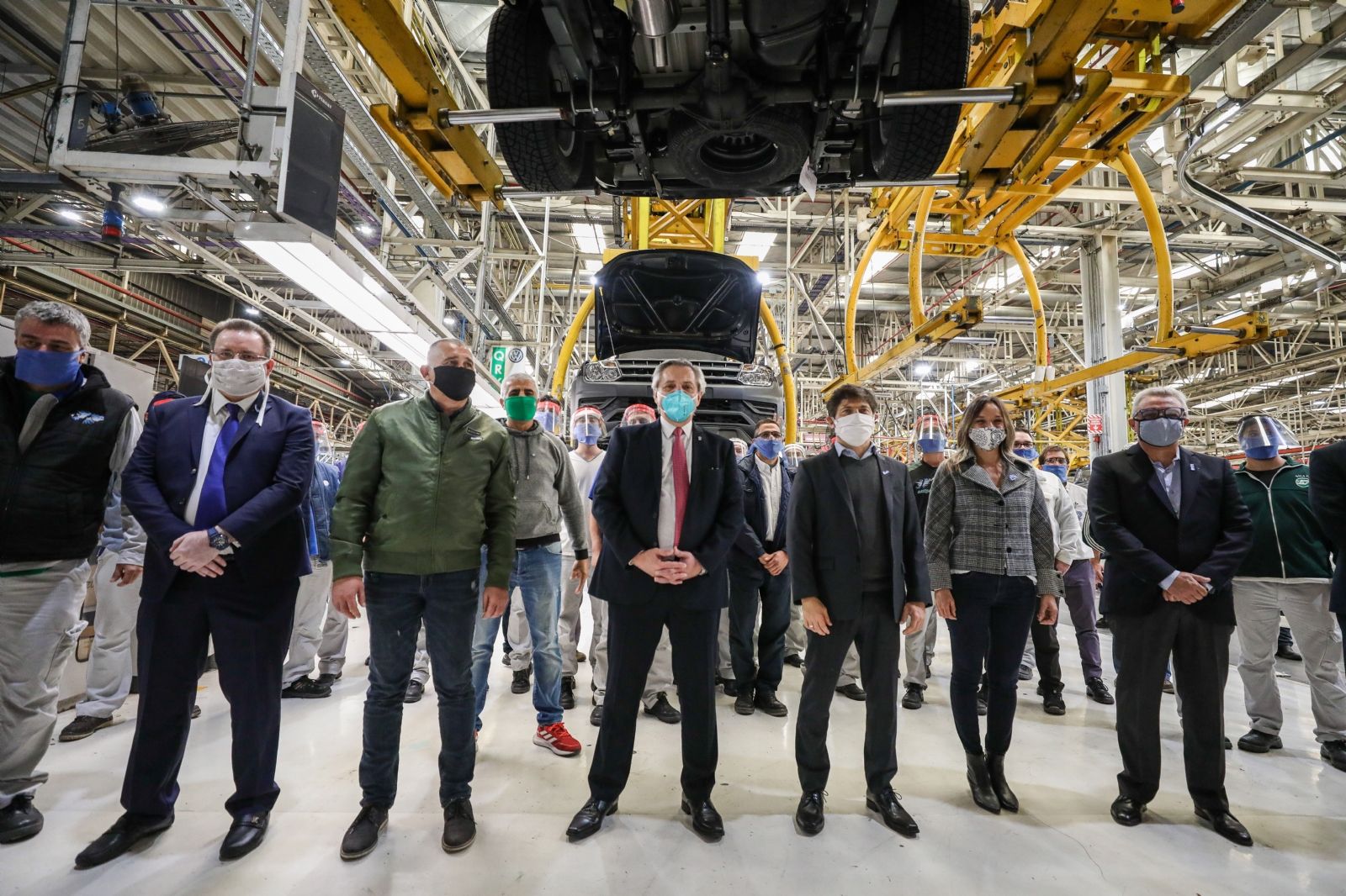 El Presidente recorrió esta mañana la planta industrial de Wolkswagen, en General Pacheco, al norte del Gran Buenos Aires, que ayer reabrió sus puertas con 1.500 de sus 3.000 trabajadores, en el contexto de la cuarentena.