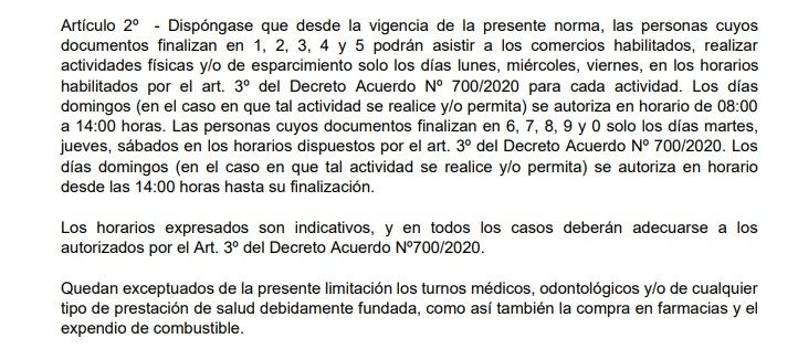 Las personas cuyos documentos finalizan en 6, 7, 8, 9 y 0 solo podrán salir a realizar actividades recreativas los días martes, jueves, sábados. Mientras que los domingos por las tardes desde las 14 hasta las 19.