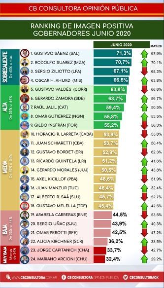 El que lidera la tabla es el mandatario de Salta, Gustavo Sáenz, mientras que el colero es Mariano Arcioni, de Chubut.