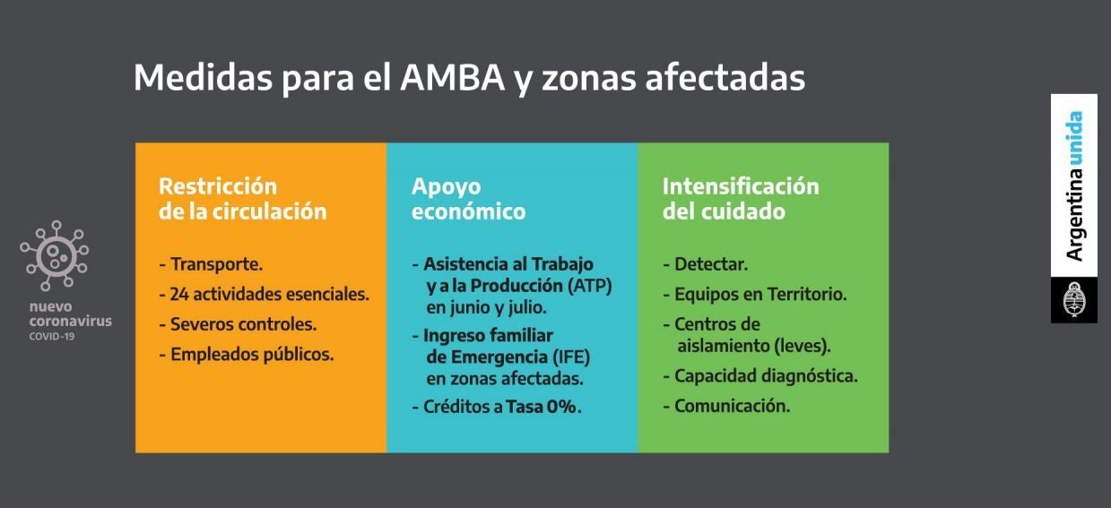 Desde el lunes, habrá restricción de circulación para el AMBA, principalmente en el transporte público y solo lo podrán usar las 24 actividades esenciales, por lo que deberán volver a renovar el permiso de circulación. "Se va a aislar el AMBA para reducir la circulacion, y por ende los contagios y la ocupación de camas", y afirmó que el transporte público "será limitado exclusivamente a los servicios esenciales, que son 24", por lo que resumió que, "desde el primero de julio hasta el 17, les pido a todos que se queden su casa" y salgan para lo esencial, en un mensaje grabado en la residencia de Olivos y emitido esta tarde.